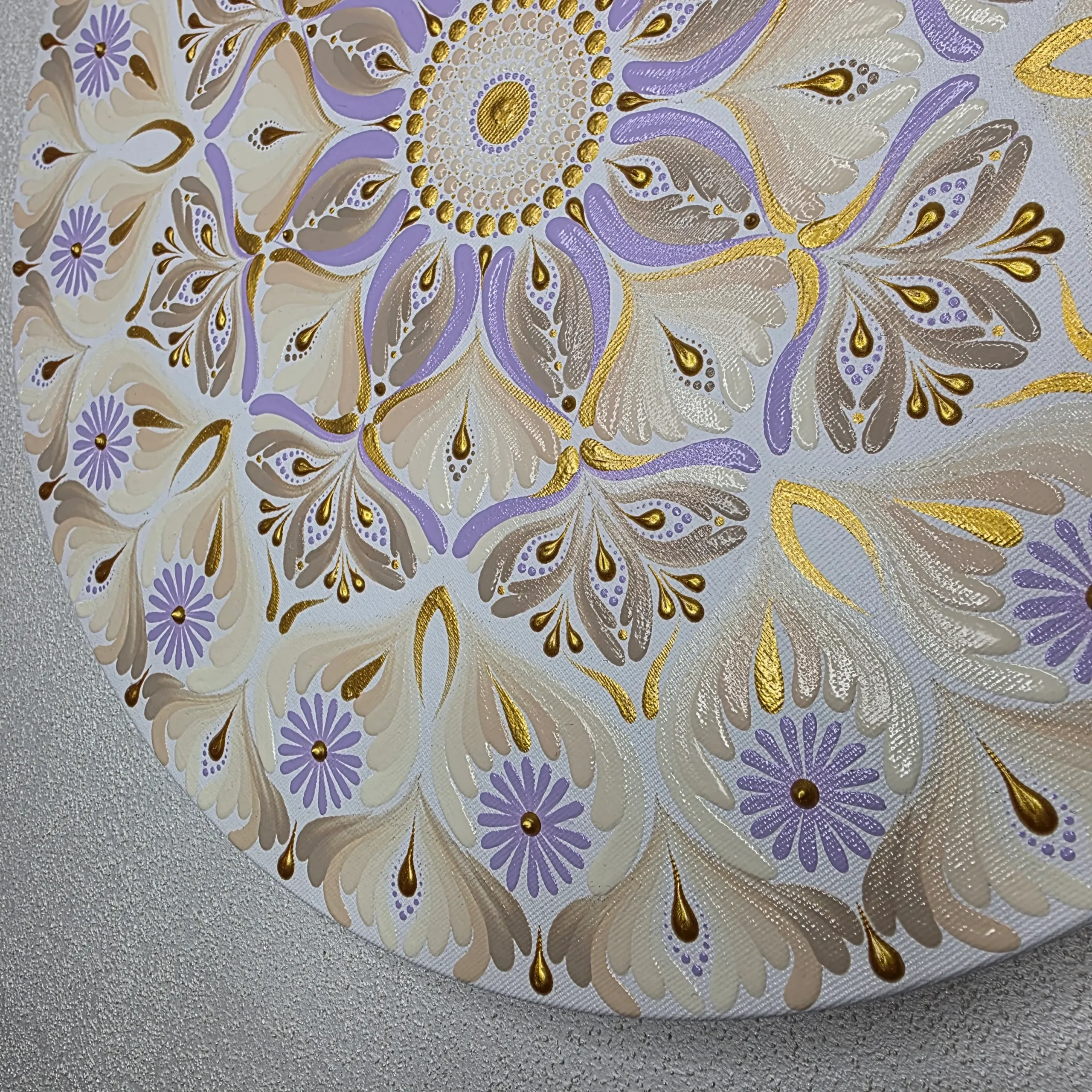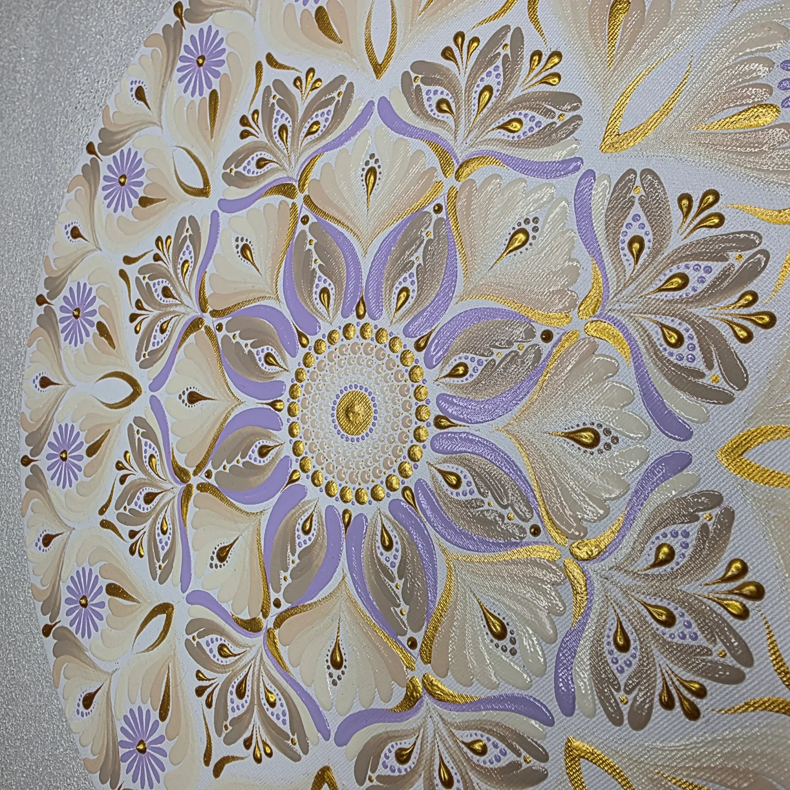 Delikatna mandala w jasnych kolorach w połączeniu z kolorem liliowym namalowana w intencji wsparcia i powrotu do domu pieska Gabi.