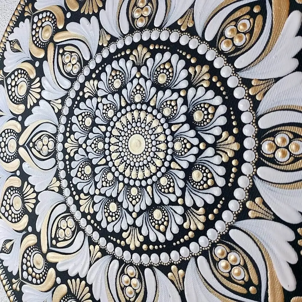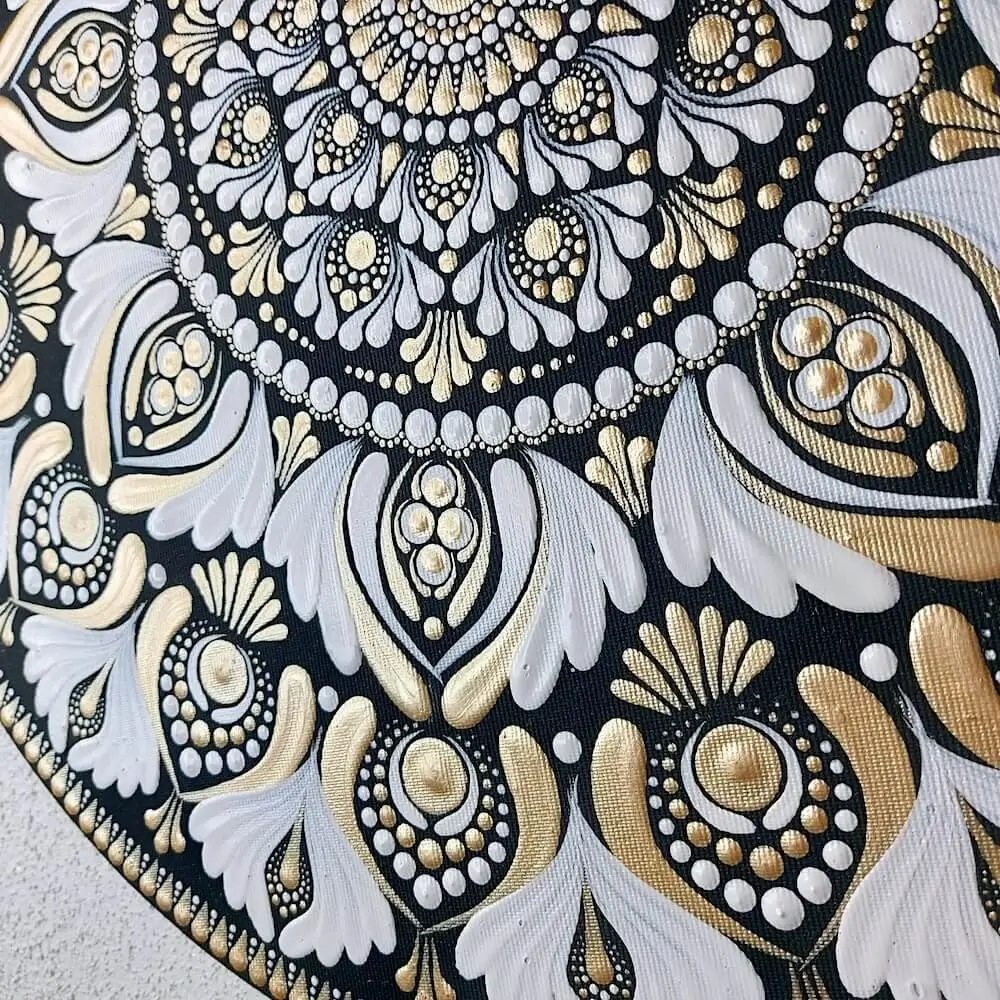 Mała, skromna mandala namalowana w intencji przynoszenia szczęścia i pomyślności. Tylko 2 kolory – biały i srebrno-złoty.