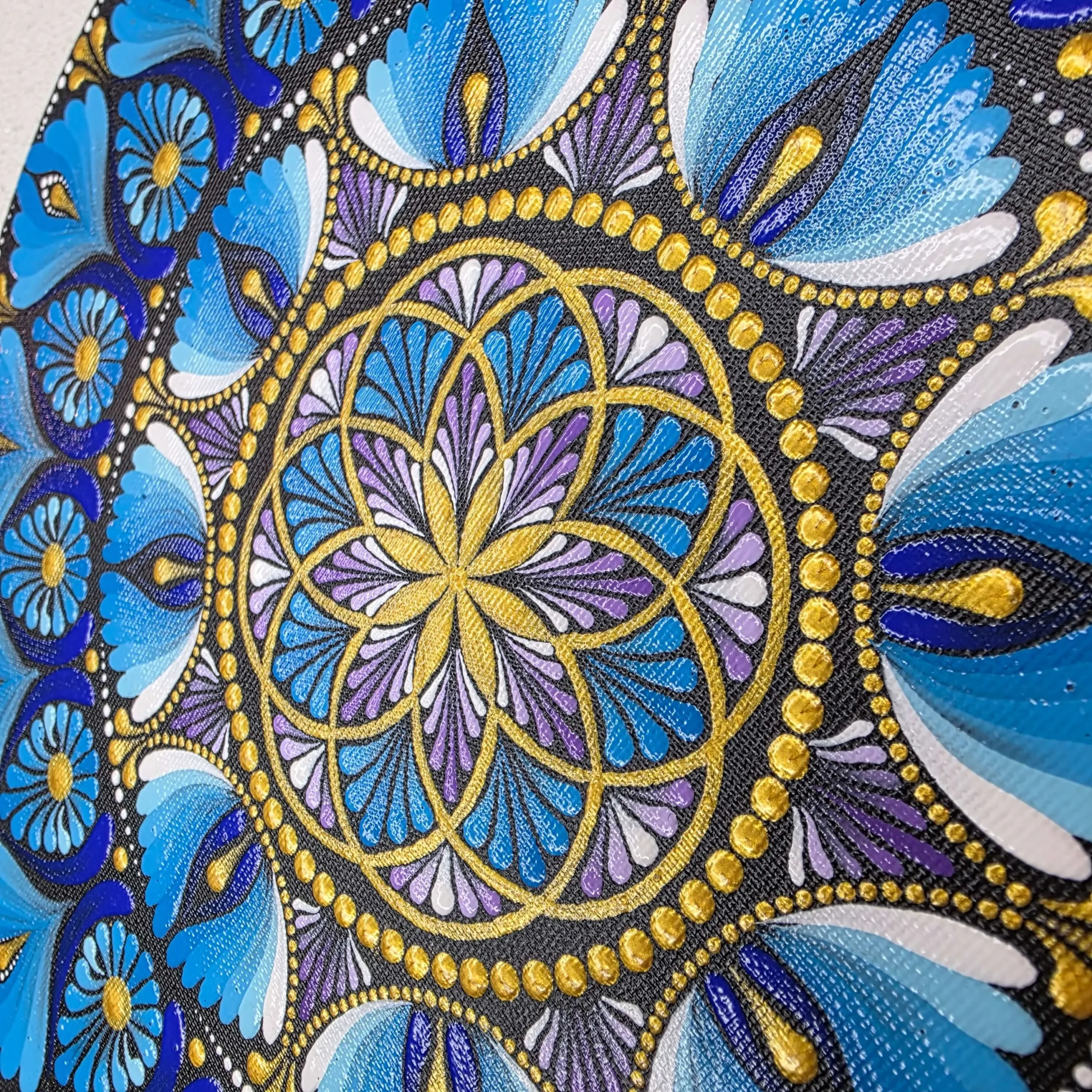 Mandala inspirowana kolorem wody, z energią spokoju i radości, namalowana w intencji przynoszenia szczęścia na nowej drodze życia.