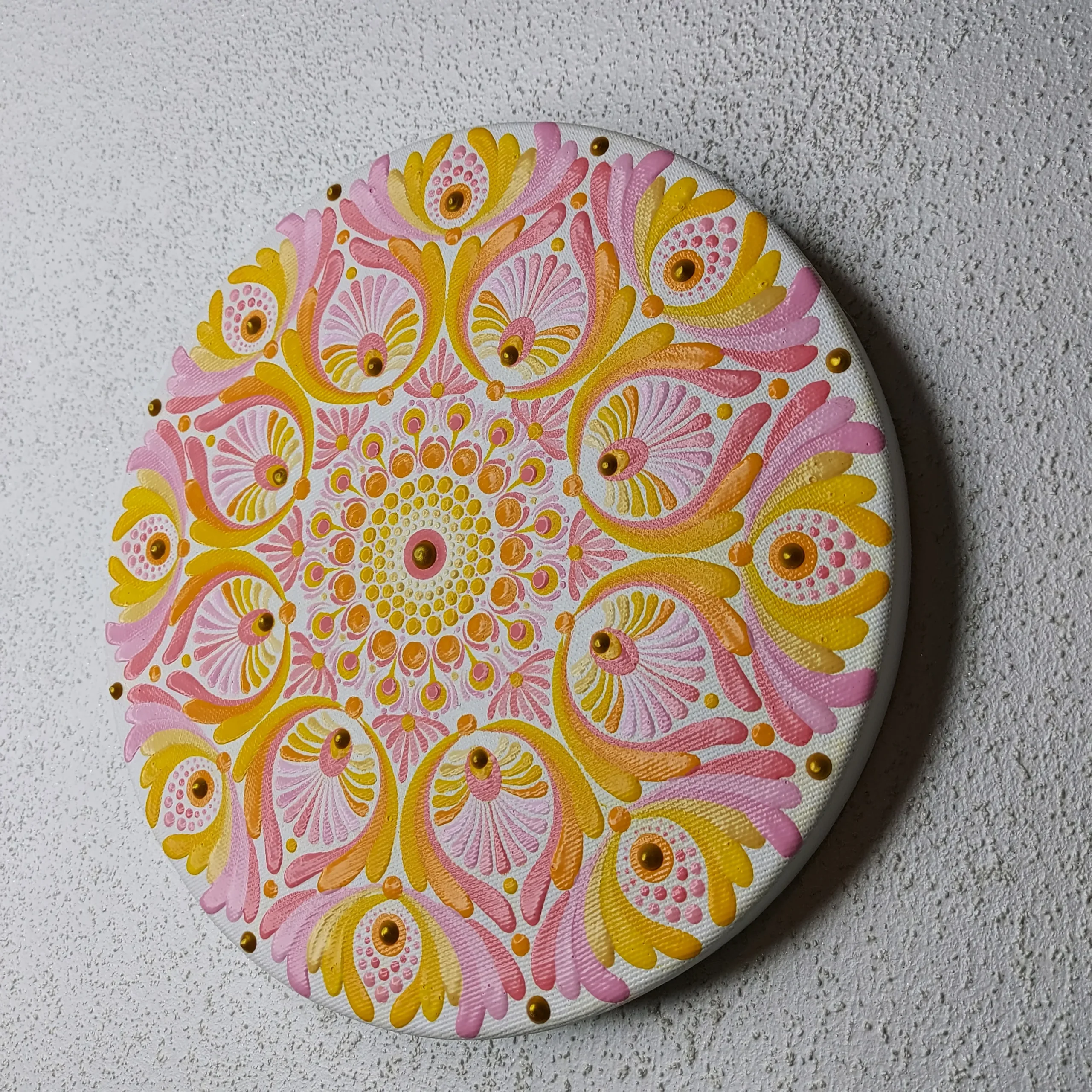 Mała mandalka w delikatnych, pastelowych, wesołych kolorach namalowana w intencji przynoszenia radości i odnajdowania dziecięcej niewinności.