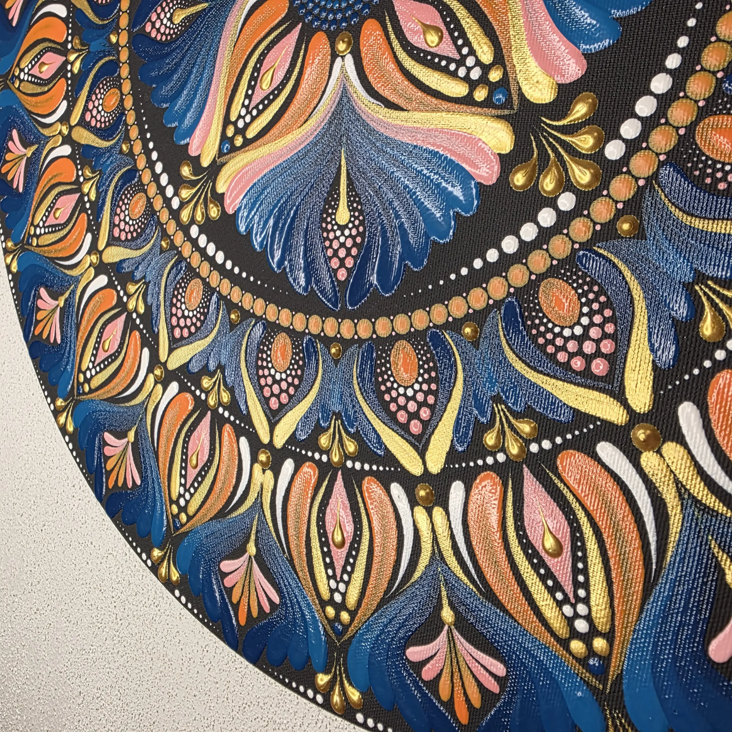 Mandala o klasycznym wzorze w szlachetnych kolorach morskiej niebieskości i łososia połączonych ze złotem. Została namalowana w intencji przynoszenia radości i dawania opieki nad osobą, która ją otrzymała.